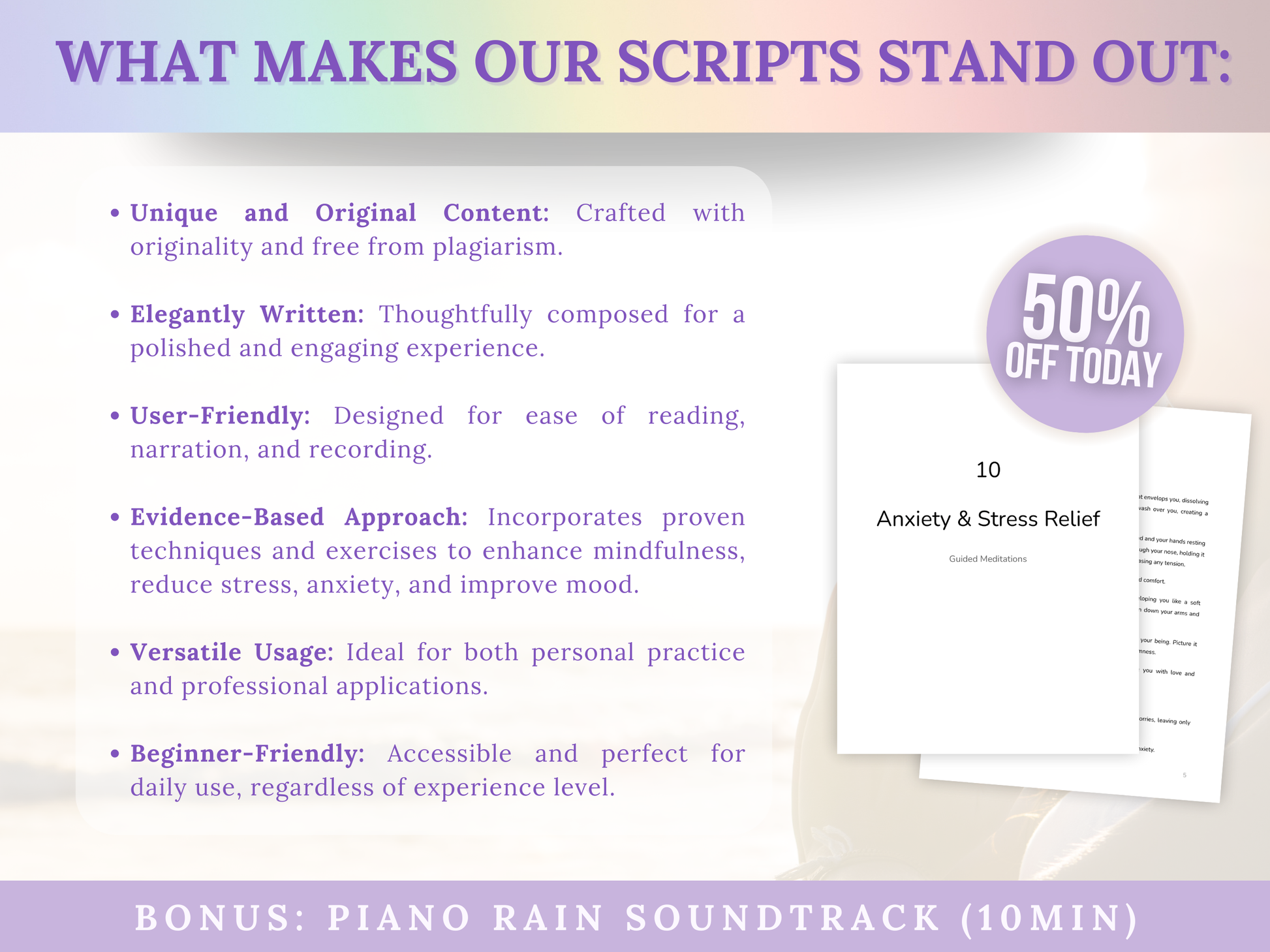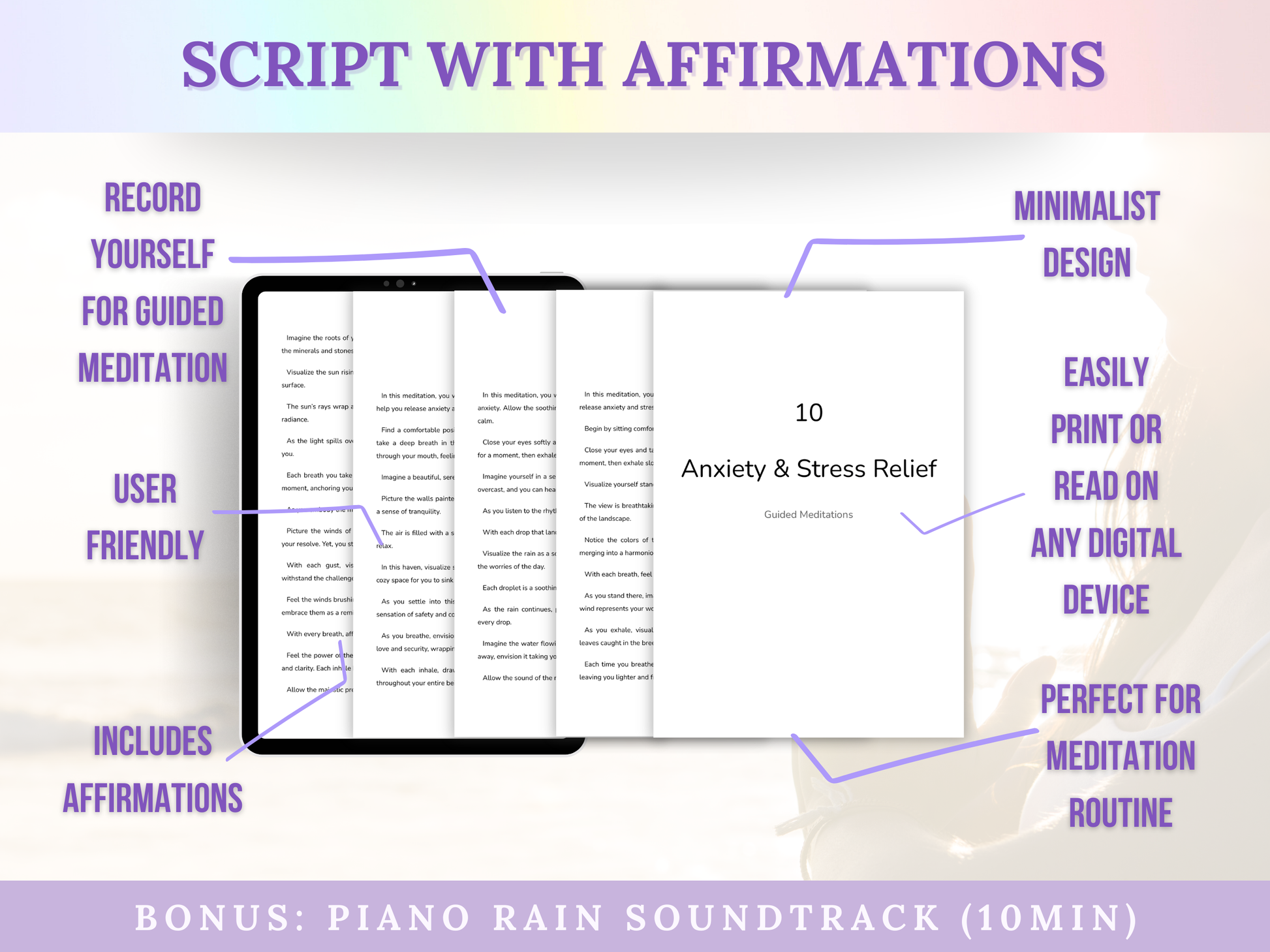This collection includes 10 expertly crafted meditation scripts focused on stress and anxiety relief. Each one offers a clear path to inner calm, helping you reconnect with balance and tranquility.