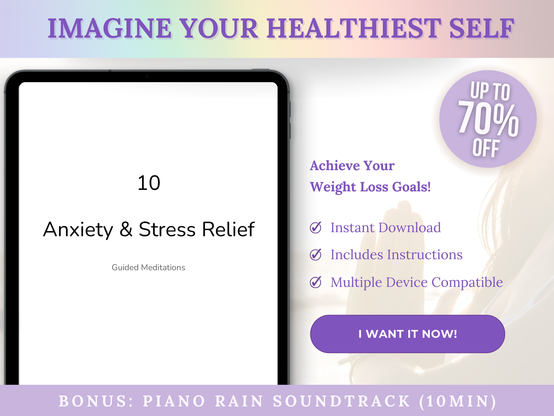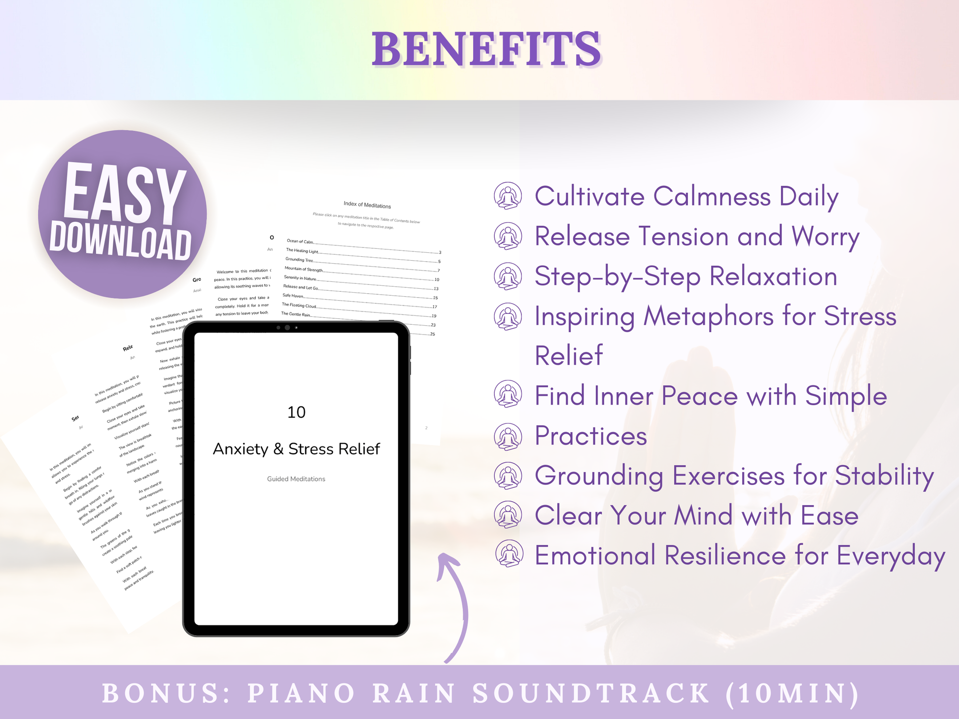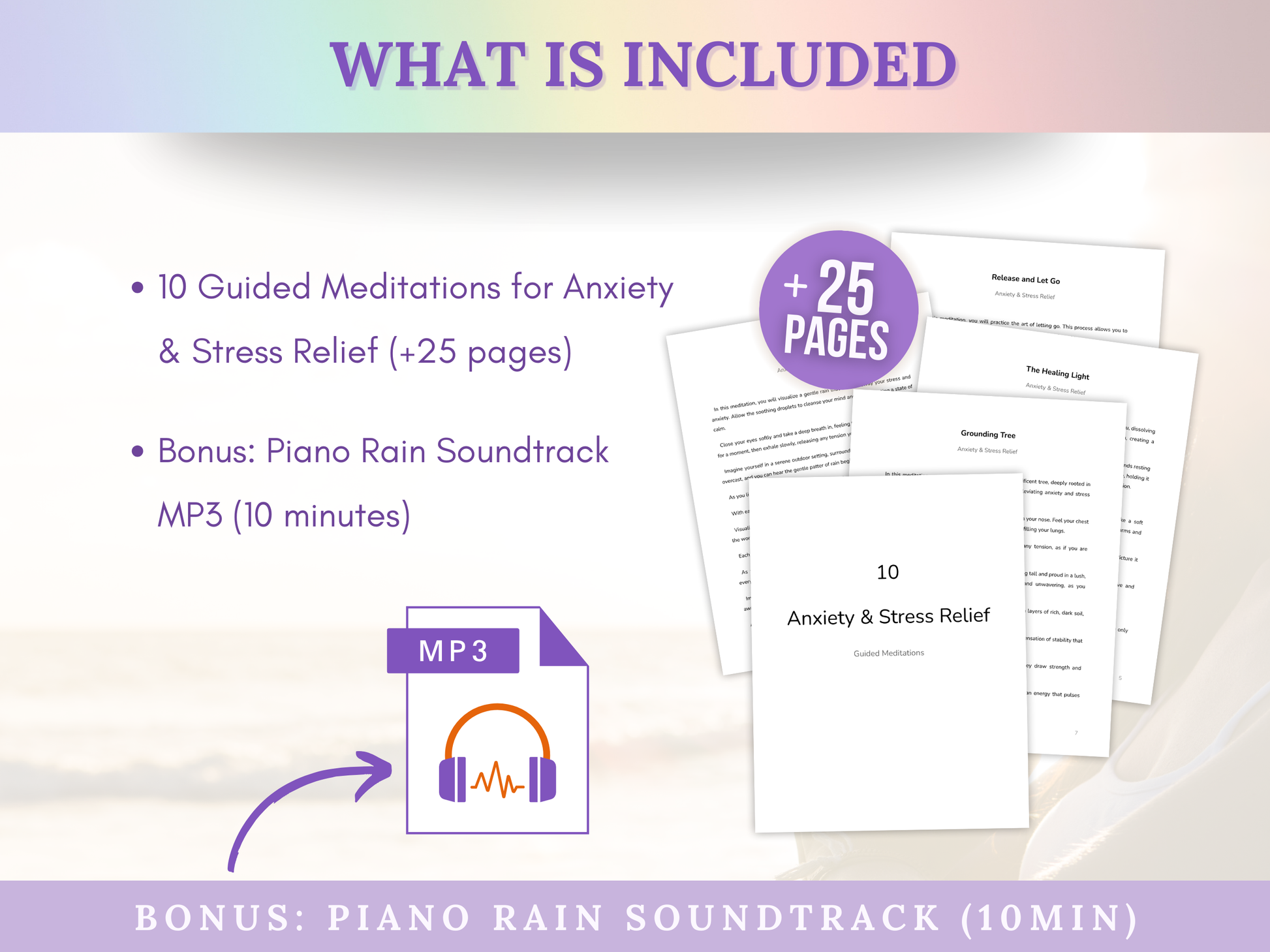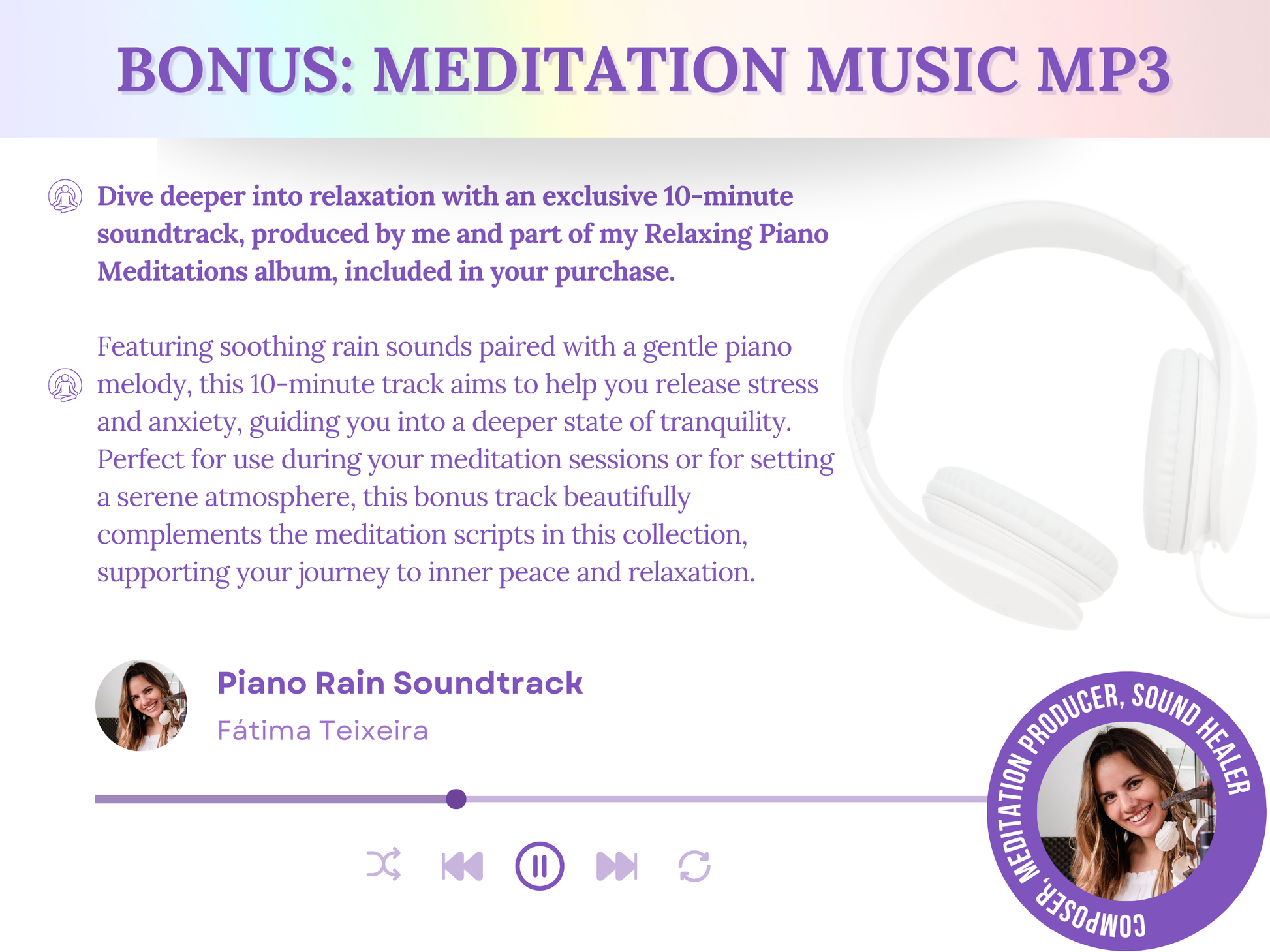 And to deepen your relaxation, this bundle includes a bonus 10-minute MP3 with a serene piano rain soundtrack from my "Relaxing Piano Meditations" album. This peaceful audio track creates the perfect ambiance for unwinding and easing stress.