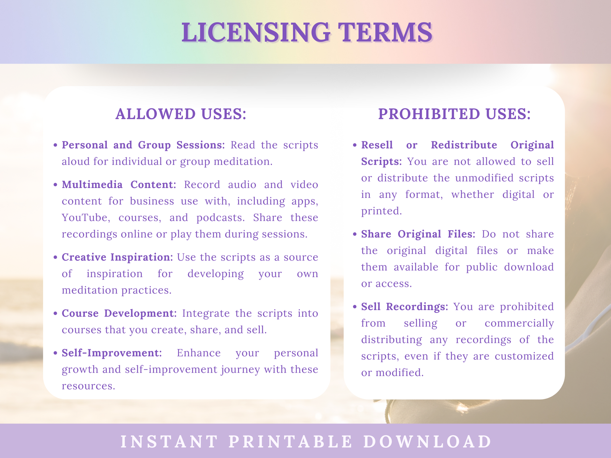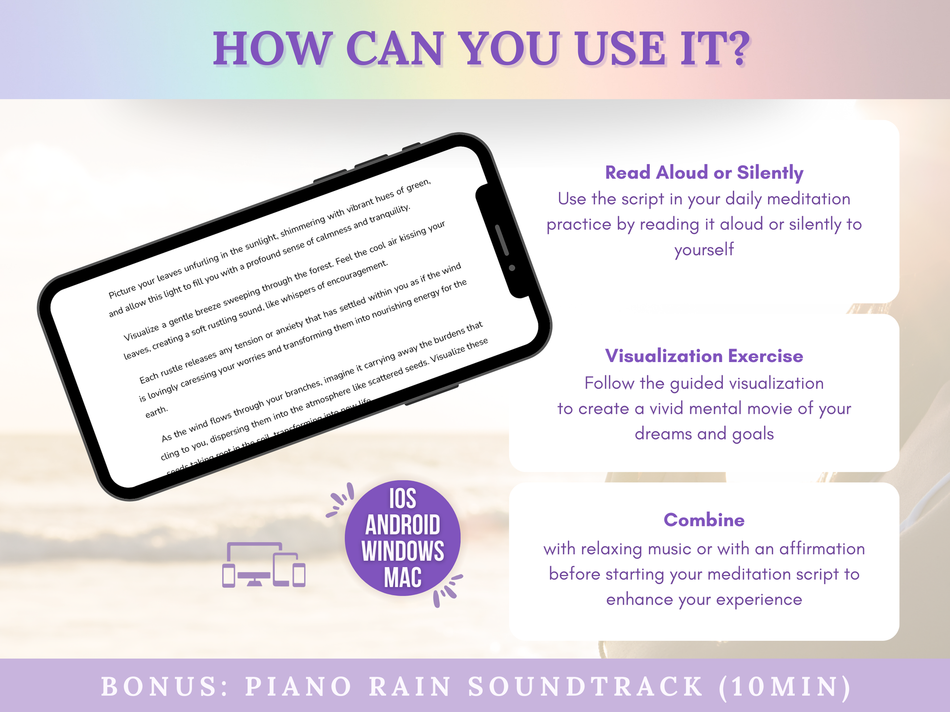After completing your purchase, you’ll have instant access to the digital download. Use the PDF scripts for guided meditation sessions and enjoy the bonus MP3 track as background music for a deeply calming experience.